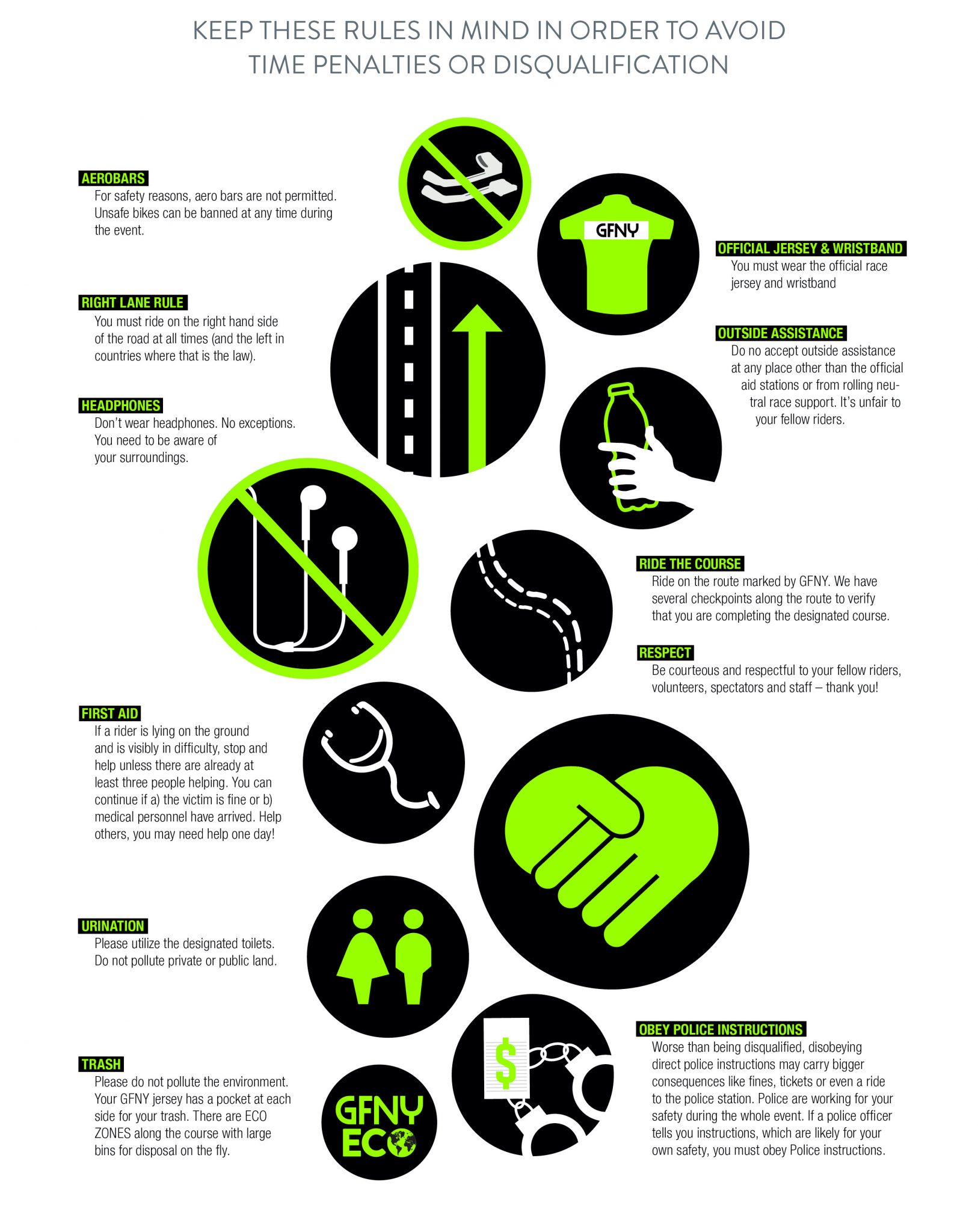 All those who ride and compete under these rules do so at their own risk. No liability shall attach to GFNY or any of its officials with respect to any loss or injury sustained or caused by anyone competing or riding in GFNY.
